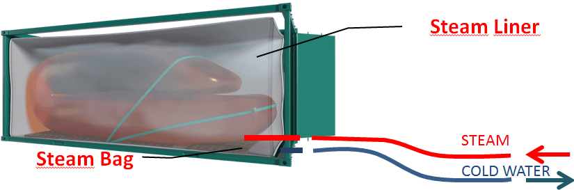 Up to 4 bars, 130 °C steam is to be applied into the Steam Bag. The steam is circulated all around the flexitank surface and heats the cargo with high transmission rate. Eventually steam condenses to cold water by transmitting its whole heat/energy to the cargo. 130°C steam condenses to 20°C water. To increase efficiency, the cold water is being discharged during the heating process.